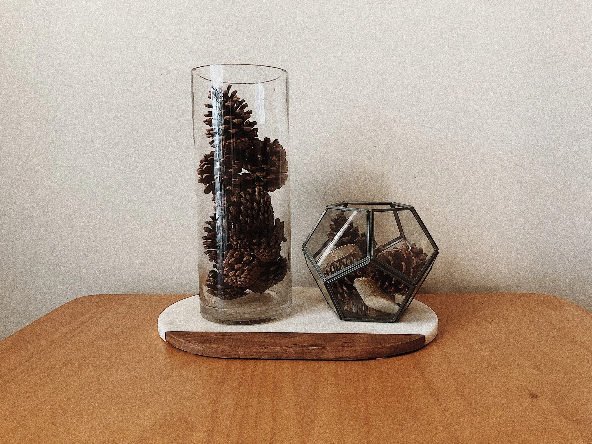 Pine cones are my go-to for both fall and winter, and it’s the only thing I do store in a Ziploc bag during the warmer months so I don’t have to gather (or let’s be honest — buy) them each year. I got a bag of fall-scented pine cones last year and they still smell good this year! I put them in a tall, wide clear glass vase on our kitchen counter and in a geometric glass container on our coffee table.