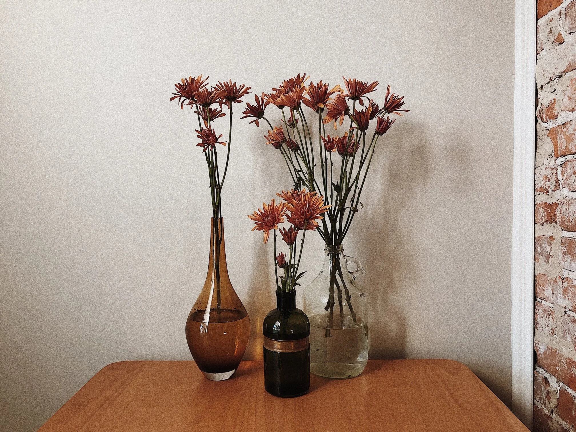 Pick up a bouquet of seasonal flowers the next time you’re getting groceries. Brighten up your space with shades of yellow, orange, maroon, or even just a bundle of moody dark greenery. This is a great way to keep your space looking fresh and new on a weekly or biweekly basis! PS I like to get one bouquet (usually the cheap $5 “filler” ones) and split them between two or three vases to spread the love throughout our house.